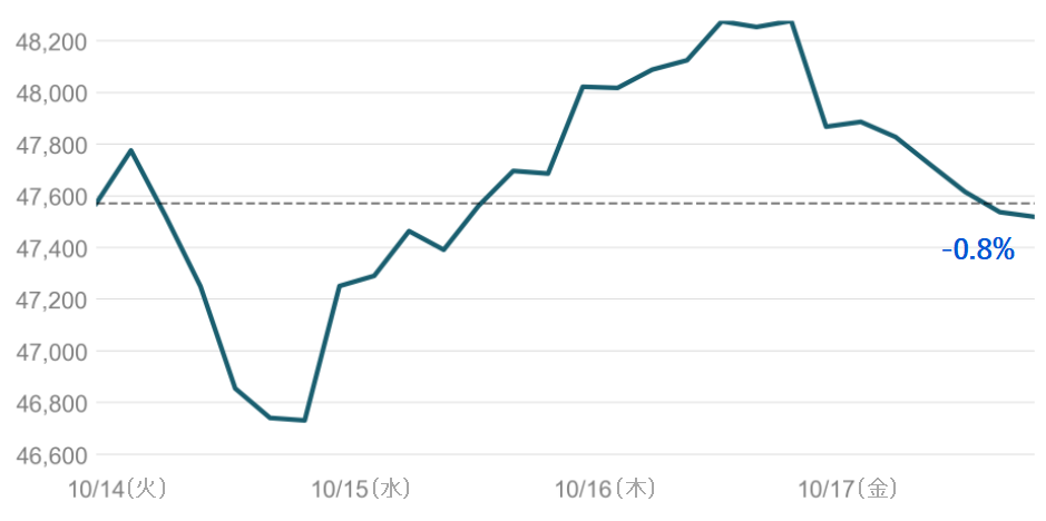 月曜(スポーツの日)は休場、火曜は政治不透明感や外部環境を受けて大幅安(終値46,847)。ただ、水曜は半導体を中心にリバウンド(47,672)、木曜は48,278まで上昇。金曜は47,582へ小反落し、週トータルでは高値圏にとどまる形でした。Reuters+1
